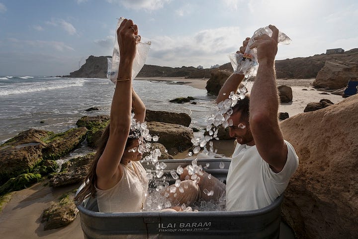 On the same street in Hadera lived Tal (39) and Giora (32), both breathing and cold exposure instructors, each in their own peaceful world. They never imagined they would find love in a time of war. Ilay Baram was a pioneer of ice bathing in Israel. He went to dance at the “Nova” festival and was murdered there. His tin bathtub with his name painted on it became a lasting memory. On October 17th 2023, Tal and Giora met at Ilay’s memorial. Giora’s smile touched Tal; her gentleness warmed him. They became one breath, moved in together by the sea, and are getting married this summer. They teach people to take ice baths and breathe through the pain. “An ice bath teaches pain and security and connection,” Giora says.