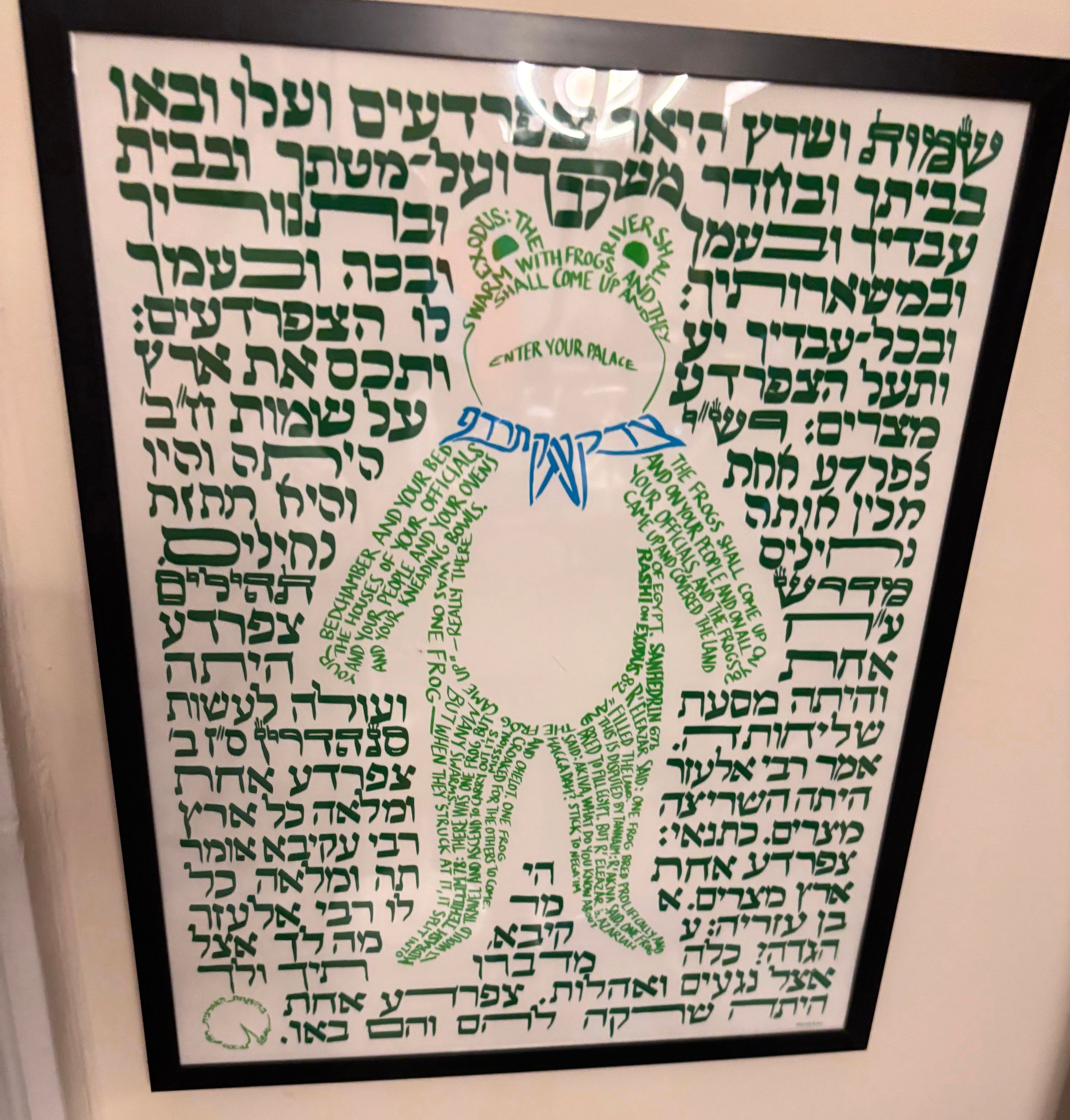 “I chose this piece of art for a few reasons: my husband saw this online, and even though I do not read Hebrew - neither does he - the description said it was the story of Exodus written in Hebrew. The frog was created by a Jewish artist, who was inspired by people dressed as frogs across to cities resisting ICE.” -Andrea, NYC
